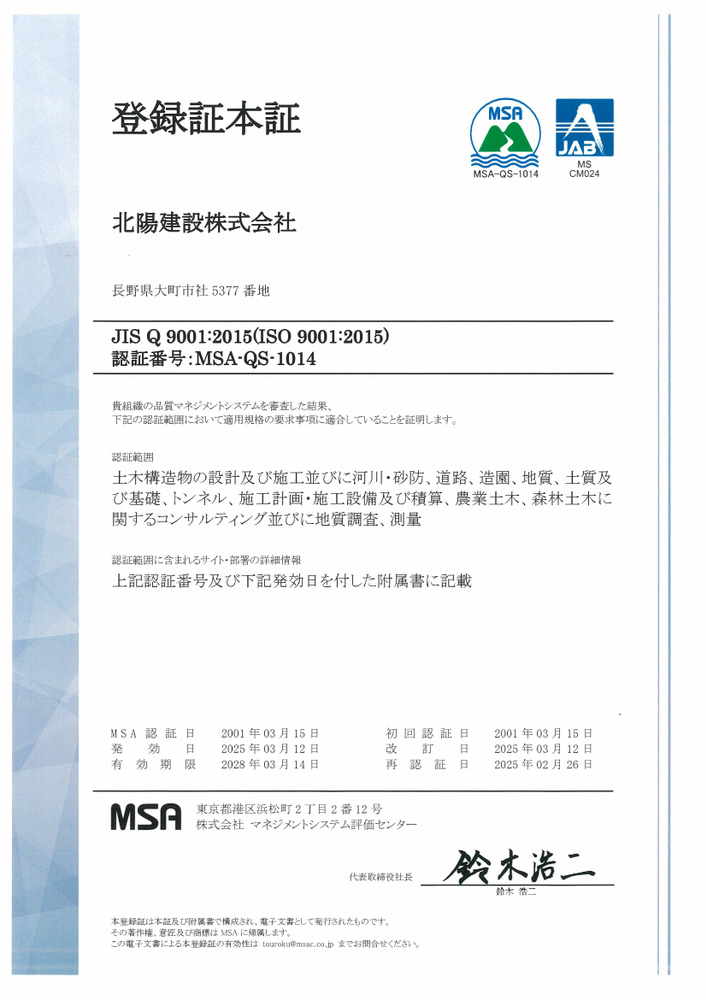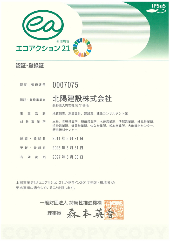 - 北陽建設株式会社は、長野県を中心として、厳しい自然環境とともにフォッサマグナという複雑な地質構造で磨いた高い技術力と自然への想いを事業活動に活かすため、環境に配慮した設計・施工の普及に努力し《豊かな自然環境》《地域社会》と事業活動の隆盛を併立させるとともに、当社の事業活動が地球環境に様々な影響を与えていることを自覚し、環境負荷を可能な限り小さくするために、エコアクション21環境経営システムの運用、継続的改善に努め、常に環境への取り組みを自主的・積極的に行い、持続可能な循環型社会を実現する活動を全社員で取り組んでまいります。