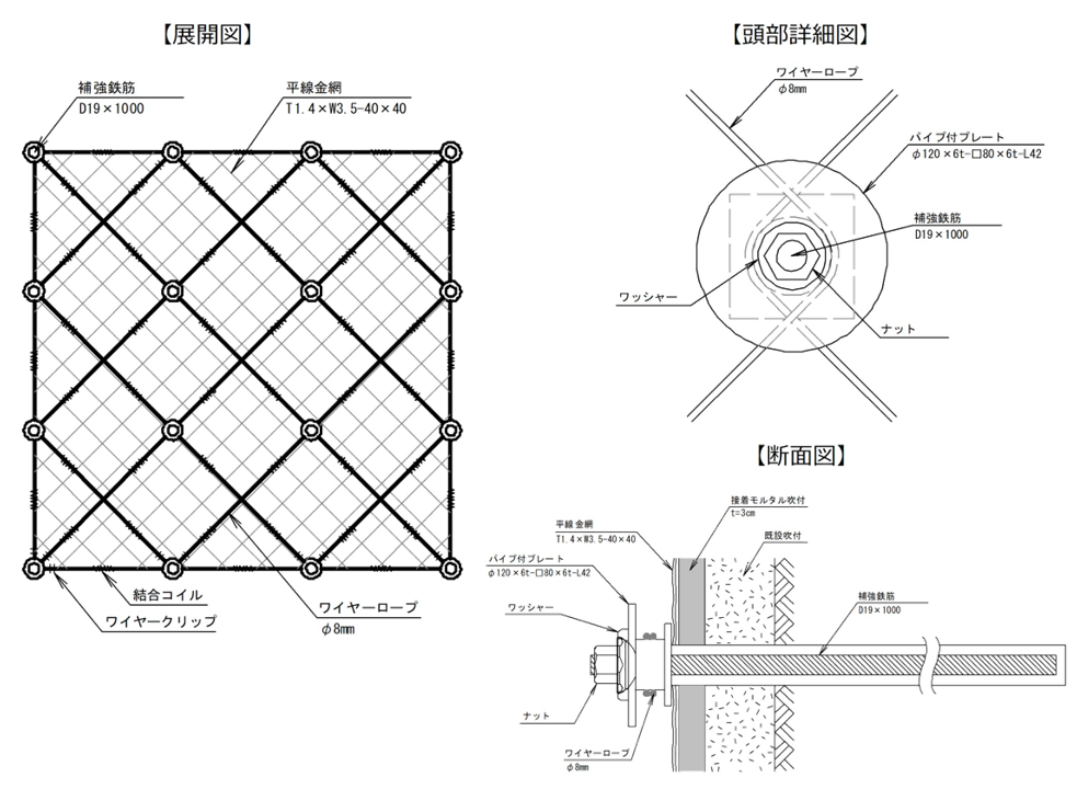 | 安全性の向上 | 平線金網及びワイヤーロープを表面に被覆する構造により、半永久的にモルタルの剥離が防げるため、第三者への安全性が向上します。また、剥ぎ取り作業が無いため、剥ぎ取り時の予期せぬ崩壊による作業員への危険を抑制できます。 |