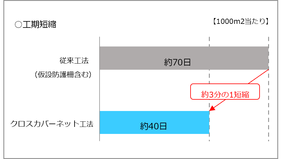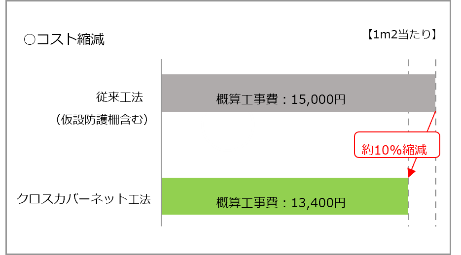 安全性の向上 | 平線金網及びワイヤーロープを表面に被覆する構造により、半永久的にモルタルの剥離が防げるため、第三者への安全性が向上します。また、剥ぎ取り作業が無いため、剥ぎ取り時の予期せぬ崩壊による作業員への危険を抑制できます。 |