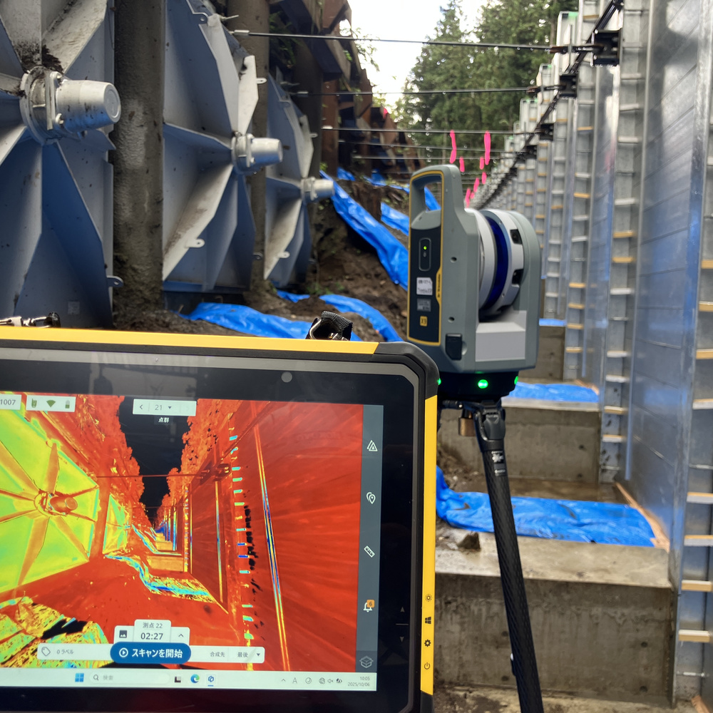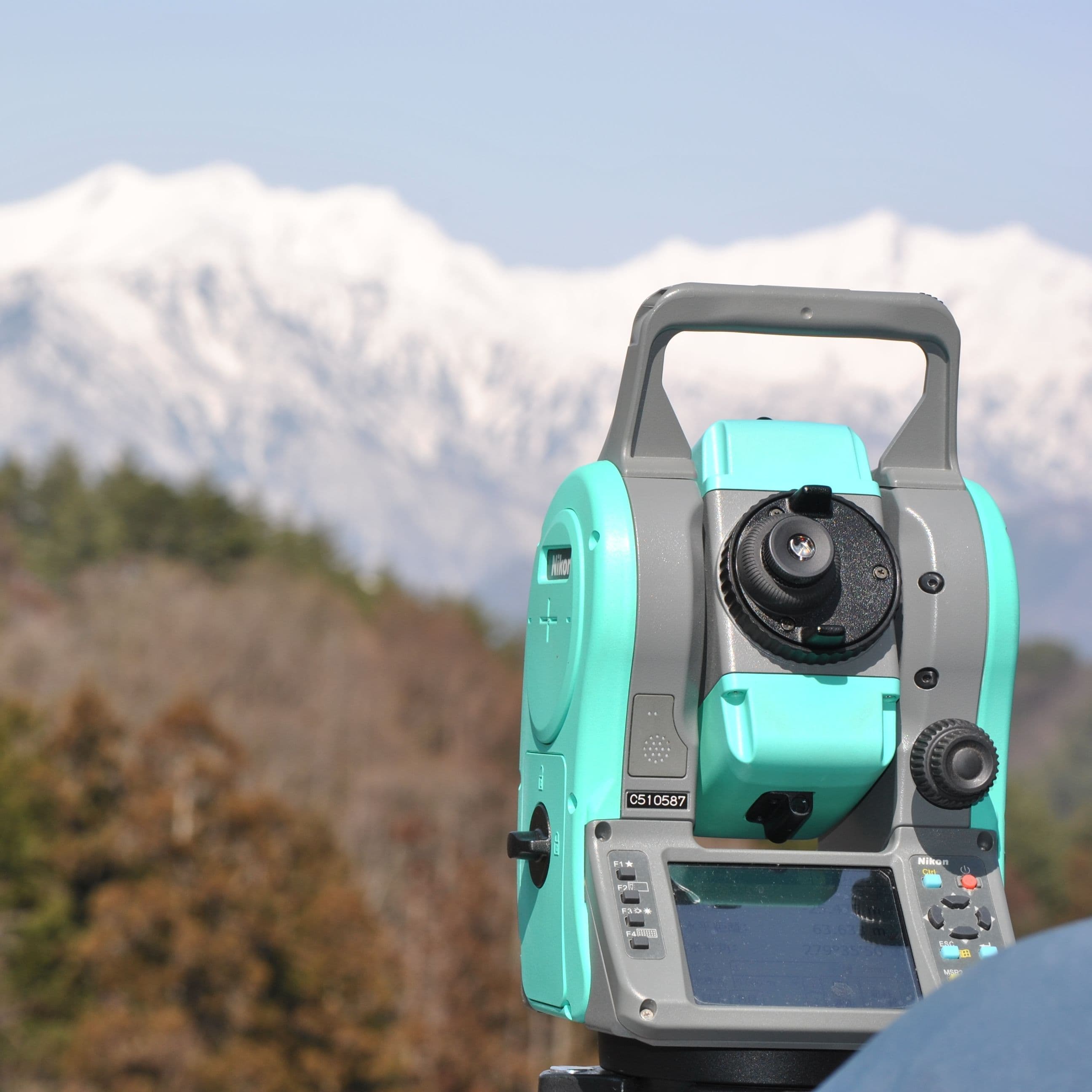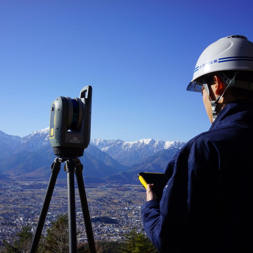 最近の測量業界では機器の進化がめざましく、短時間で数千万点の3次元座標を計測するレーザスキャナや、測位衛星から電波を受信して位置情報を計測するGNSS機などが用いられ、今までの1点1点の測量から短時間で面的(高密度)な3次元測量が可能となりました。