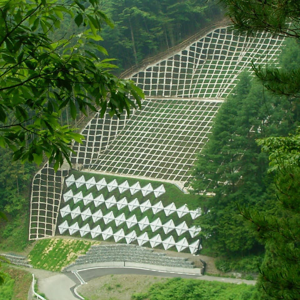 斜面の浸食や風化、崩壊を防止するために、コンクリートの格子で被覆し、安定させる工法です。