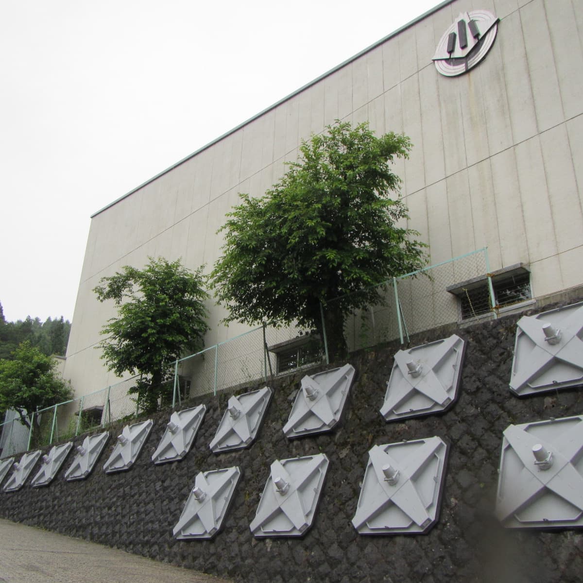 不安定な斜面を安定させるために、山に鋼線を挿し込んで縫い付け、動かないように止める工法です。
