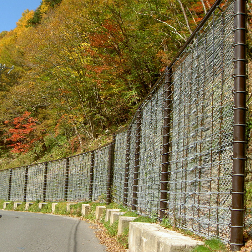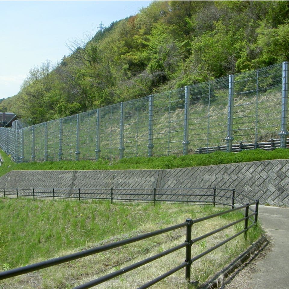 斜面上にある落下しそうな岩や石を斜面に固定したり、斜面の下で受け止める柵を設置する工法です。