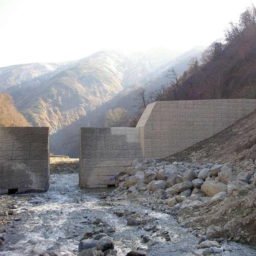 斜面災害などで発生する土石流の流出を防ぎ、水の流れを緩めます。