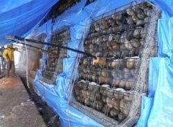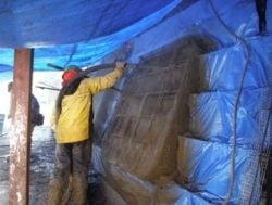 工場出荷の際にはT字金網を開いた状態での数十基のエフケー不陸調整枠を重ね積みし、専用のビニールラップを巻いて保護します。